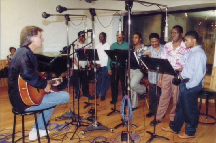 Steve (with Paul Simon's guitar) teaching "Peace Train" to Ladysmith Black Mambazo at The Hit Factory in New York in 1996